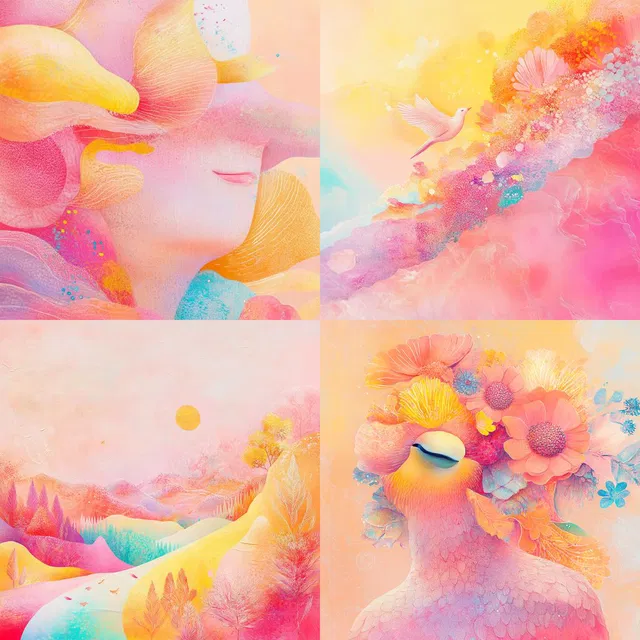 Доминируют светлые пастельные оттенки и воздушные градиенты, которые создают сказочную атмосферу, напоминающую сюрреалистическое и импрессионистское искусство. В этом стиле прекрасно удаются плавные формы и гармоничные композиции, через яркие и мягкие цвета передаются причудливые сюжеты. Он изображает фантастические миры с утопическим видением, но может не обладать фотореализмом в техническом или реалистичном контексте. Идеален для иллюстраций в жанре фэнтези и креативного дизайна, прекрасно раскрывается в художественном самовыражении, но уступает в точном и детальном реализме.