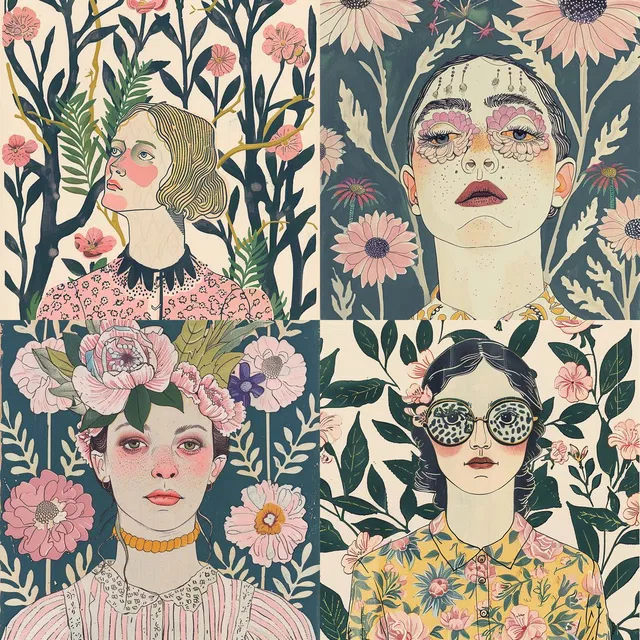 Изящные растительные мотивы переплетаются с пастельными оттенками, создавая спокойный, но яркий визуальный язык. В этом стиле прекрасно передаются органические формы с помощью структурированного, повторяющегося подхода к дизайну, напоминающего модерн. Хотя его сильная сторона — это иллюстративные качества и гармоничная цветовая палитра, иногда ему не хватает глубины в фотореалистичных контекстах. Этот стиль идеально подходит для применения в моде, редакционном дизайне и декоративном искусстве. Он особенно хорош для передачи тем, связанных с природой и устойчивым развитием.