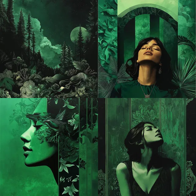 Этот стиль воспевает пышную, монохромную зелёную палитру. В нём искусно переплетаются природные мотивы с сюрреалистичными, сказочными элементами. Композиции насыщены ботаническими деталями, многослойными элементами и витиеватыми узорами, напоминающими модерн и символизм.
