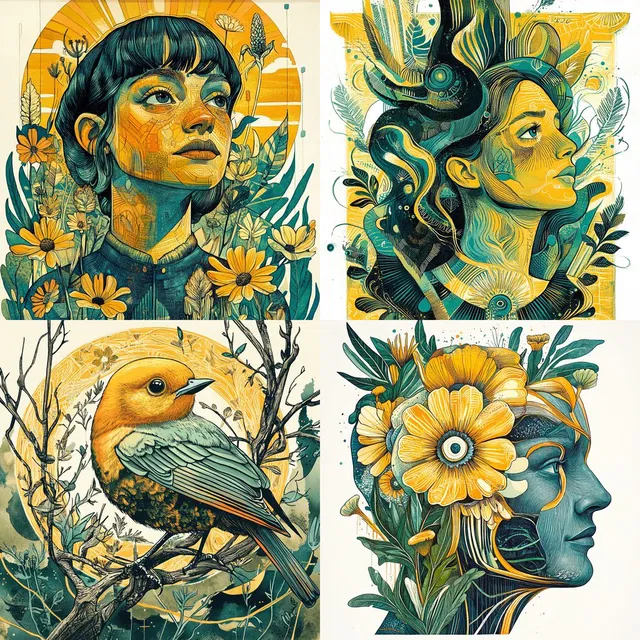 Яркие ретрофутуристические иллюстрации сочетают замысловатые линии с насыщенными контрастными цветами, создавая динамичное взаимодействие между природой и технологиями. Характер иллюстраций проявляется в детальных и выразительных композициях, часто включающих стилизованные фигуры людей, животных и абстрактные формы.