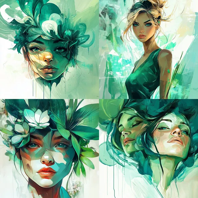 Эфирная зелёная динамика завораживает ярким использованием зелёного цвета и текучих форм, создавая сказочную атмосферу в различных сюжетах. В этом стиле особенно хороши живописные мазки кисти и выразительные композиции, объединяющие элементы природы, городских пейзажей и абстрактных форм в единое визуальное повествование.
