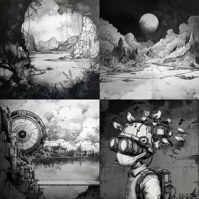 Этот стиль отличается детальной прорисовкой и вызывает яркие образы. Зритель легко представляет себе картину благодаря сложной проработке линий и монохромной палитре. Композиции тщательно продуманы: в них гармонично сочетаются элементы природы и архитектуры с элементами сюрреализма. Использование света и тени создаёт глубину, усиливая атмосферность каждого произведения.