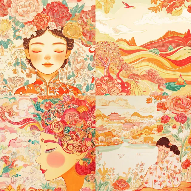 Тёплые тона и насыщенные цвета создают живое и динамичное визуальное впечатление. Детальные мотивы и плавные линии добавляют глубину и сложность.