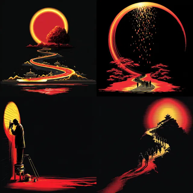 Этот стиль выделяется яркой красно-золотой палитрой. Он создаёт высококонтрастные, насыщенные изображения, которые притягивают взгляд. Его графическая чёткость и точность проявляются в разных темах — от футуристических городских пейзажей до зачарованных лесов.