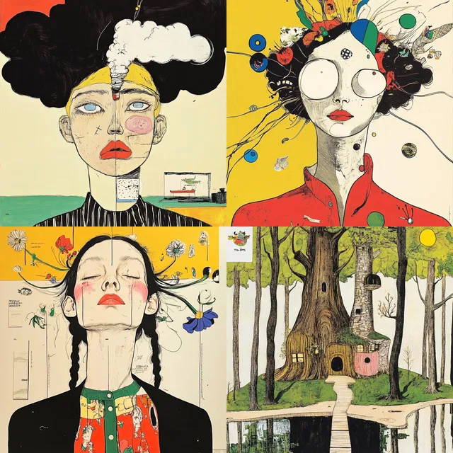 Этот яркий и эклектичный стиль объединяет причудливую игривость с сюрреалистичными, похожими на сон чертами. Выразительный и эмоциональный, он охватывает разнообразные темы с помощью смелых цветов и динамичных композиций. Замысловатые детали и плавные формы в этом стиле создают ощущение движения и энергии, напоминая поп-арт и сюрреализм.