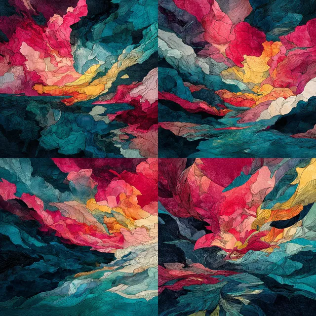 Этот стиль отличается яркими цветами и замысловатой прорисовкой. Динамичные композиции и насыщенные оттенки сливаются воедино. В каждом произведении — сложное переплетение текстур, создающее многослойное визуальное впечатление и захватывающее зрителя.