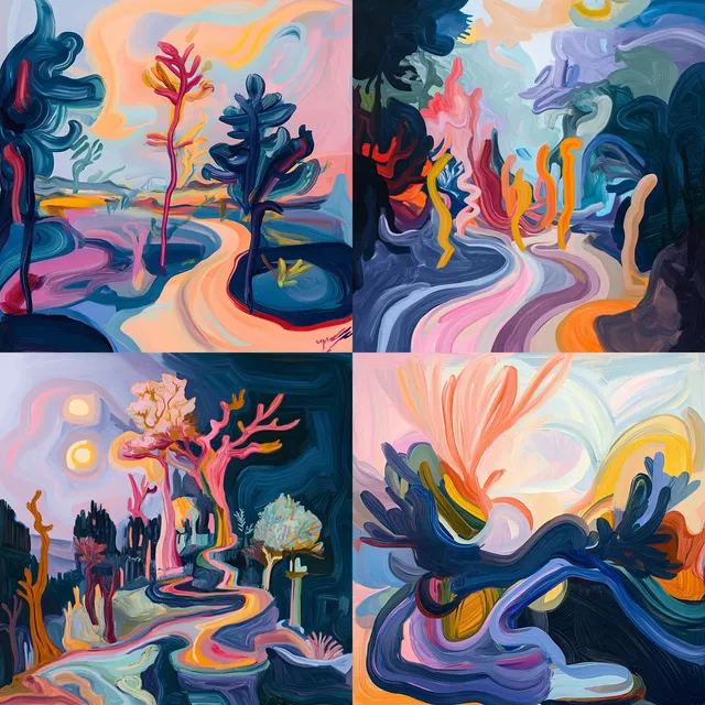 В экспрессивной абстракции преобладают витиеватые линии и яркие цветовые гаммы, создающие динамичные композиции. Этот стиль превосходно справляется с эмоциональным повествованием, используя смелые мазки кисти и многослойные текстуры для передачи энергии и движения.