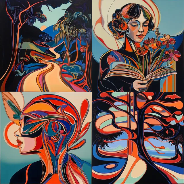 Для этого стиля характерны яркие цвета и динамичные композиции. Его отличают выразительные линии и резкие контрасты. Органичные формы и плавные очертания создают ощущение движения, напоминая модерн и абстрактный экспрессионизм.