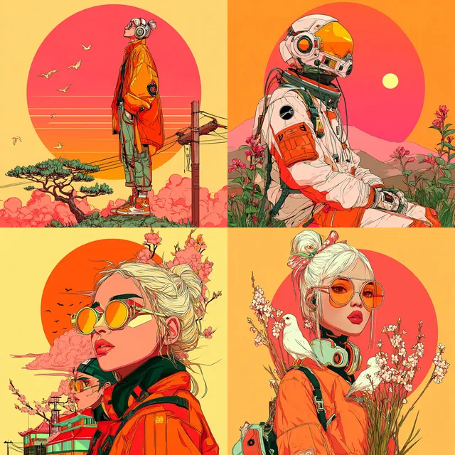 Этот стиль определяют яркие цветовые палитры и динамичные композиции. Для него характерны смелые контуры и графическая эстетика. Использование насыщенных оранжевых, жёлтых и красных цветов создаёт энергичную и игривую атмосферу. Замысловатые линии и точные детали подчёркивают уникальное слияние влияний поп-арта, киберпанка и манги.