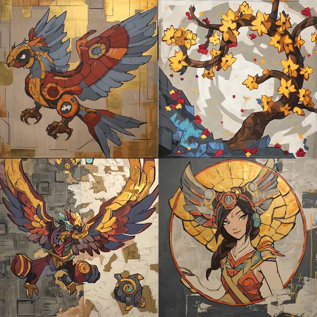 В этом стиле используется структурированный подход, часто включающий повторяющиеся узоры и графические элементы, напоминающие ар-деко и кубизм. Он отлично подходит для изображения футуристических и мифологических тем, сочетая технологические мотивы с культурными отсылками.