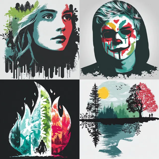 Яркие цветовые контрасты и смелые линии определяют этот стиль, создавая динамичное взаимодействие между графическими элементами и выразительными формами. Использование многослойных текстур и двуцветных контрастов усиливает глубину и визуальный интерес, а интеграция влияния городского и поп-арта добавляет современности.