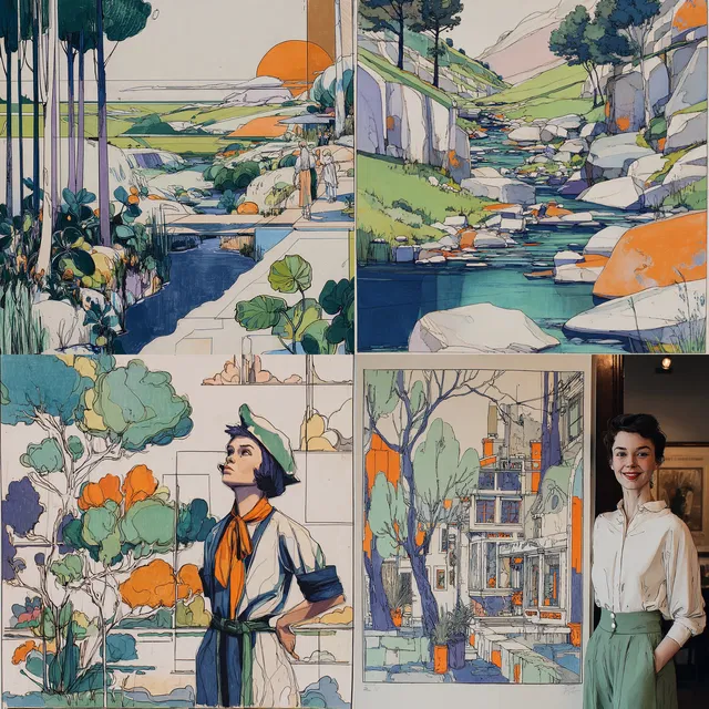 Архитектурные изображения в этом стиле геометричны и выполнены в модернистском духе, а персонажи отличаются индивидуальностью и выразительностью. Использование смелых очертаний и чётких контуров усиливает визуальное повествование, создавая гармоничное сочетание структуры и креативности.