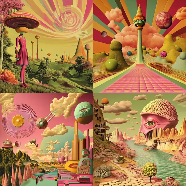 Стиль «Whimsical Retro Futurism» очаровывает яркими, сюрреалистичными пейзажами и смелыми геометрическими узорами. Вдохновлённый поп-артом 1960-х годов и эстетикой модерна середины века, он создаёт сказочные сцены с абстрактными формами и ретро-персонажами.