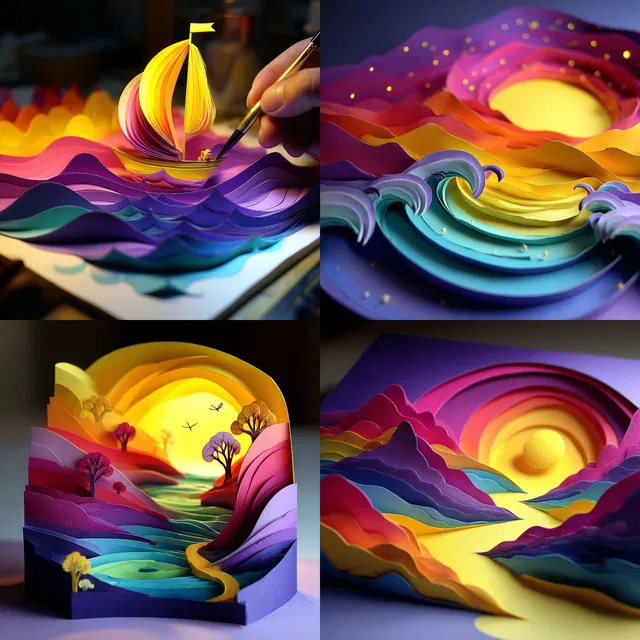 Этот стиль ярко воплощает тактильное очарование многослойного бумажного искусства. Он превращает каждый запрос в яркое зрелище цвета и объёма. Техника прекрасно подходит для создания скульптурных форм и фактурных поверхностей, придавая изображению игривый, причудливый шарм, который завораживает зрителя.