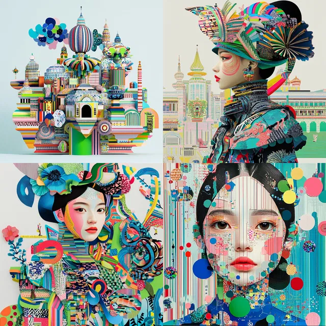 Этот стиль отличается ярко выраженной динамикой и насыщенностью текстур. Он наполнен живыми красками и замысловатыми узорами, что создаёт эффектный и игривый визуальный образ. Композиции многослойные и многомерные, часто включают геометрические мотивы и эклектичные элементы, вдохновлённые разнообразными глобальными эстетиками.