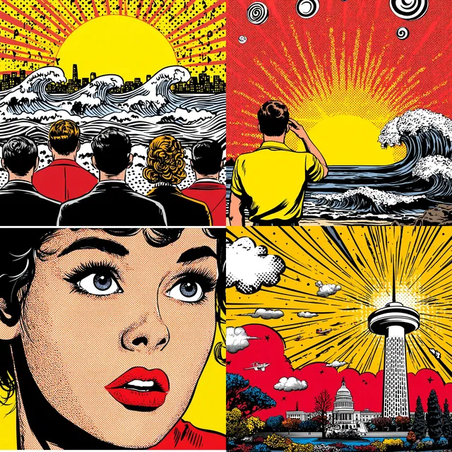 Яркий стиль поп-арт, который характеризуется чёткими контурами, полутоновыми тенями и насыщенной цветовой палитрой жёлтого, красного и чёрного цветов. Этот стиль прекрасно передаёт атмосферу ретрофутуризма и эстетику комиксов, создавая динамичные и ностальгические образы. Благодаря графическим контрастам и выразительным персонажам он идеально подходит для графических романов, винтажной рекламы и выставок поп-арта. Однако зависимость от поп-арт-мотивов может ограничить его универсальность в более сдержанных или фотореалистичных контекстах. Отлично подходит для тех, кто хочет добавить смелости и ностальгии в визуальное повествование.