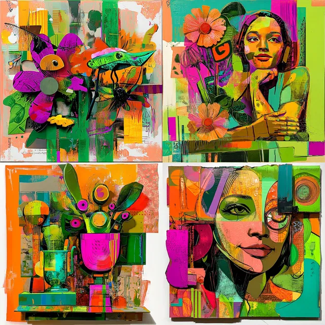 Экспрессивные цвета и динамичная композиция определяют этот стиль, сочетая поп-арт с уличной эстетикой. Слои и текстуры создают яркую, игривую атмосферу, а геометрические формы добавляют структуре упорядоченности.