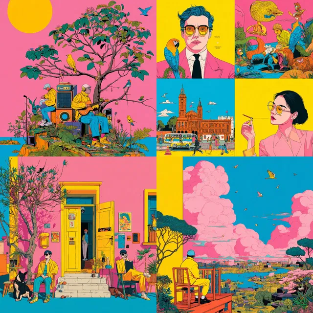 Доминируют яркие цветовые палитры, которые создают причудливую и игривую атмосферу. Композиции с чёткими контурами и толстыми рамками напоминают поп-арт и эстетику комиксов. Архитектурные решения и образы персонажей характеризуются сюрреалистичными формами и образами из снов, а выразительные лица и оживлённая мимика оживляют портреты.