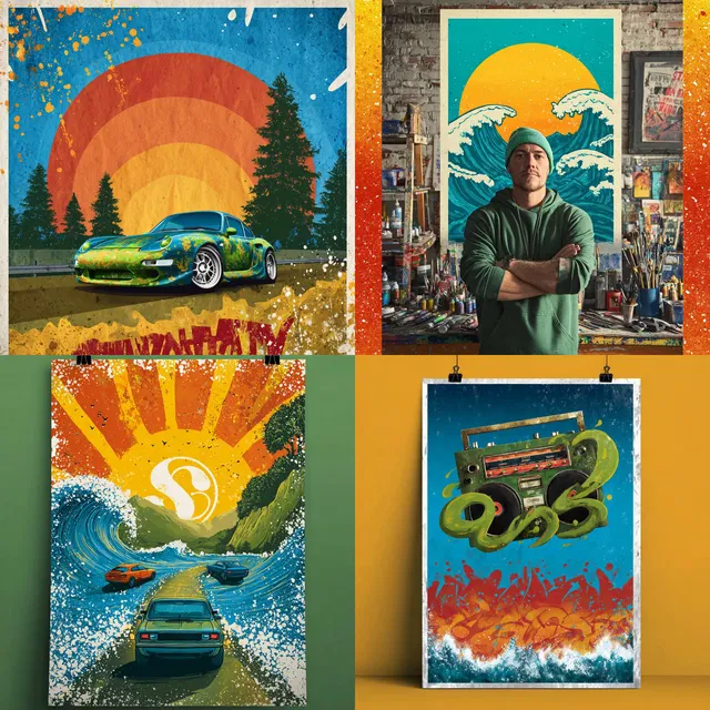Этот стиль — яркий и динамичный, он буквально переполнен энергией благодаря смелому использованию цвета и фактурных поверхностей. Композиции многослойные и сложные, часто включают в себя мотивы солнечных лучей и сияющие узоры, которые вызывают ощущение ретрофутуризма и городской культуры. Игривые и причудливые элементы сбалансированы чётким чувством структуры, что делает стиль идеальным для дизайна постеров, печатных СМИ и брендинга.