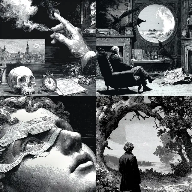 Сложный и детальный рисунок линий и выразительное светотеневое решение определяют этот стиль, напоминая о глубине и детализации гравюр XIX века. Монохромная палитра усиливает историческую атмосферу, вдохновлённую романтизмом и неоготикой.