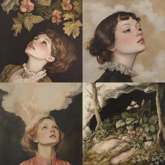 Эфирная ностальгическая мечта очаровывает своей мягкостью и деликатными оттенками, вызывая ощущение чего-то сказочного, напоминающего искусство викторианской эпохи и прерафаэлитов. Для стиля характерны приглушённые тона и пастельные оттенки, которые создают атмосферу спокойствия и безмятежности.