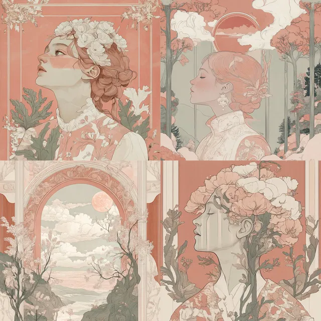Изящные линии и пастельные тона определяют этот стиль, напоминая об элегантности ар-нуво и романтизме викторианской эпохи. Замысловатые детали и витиеватые композиции создают ощущение вневременной красоты, с акцентом на ботанических мотивах и исторических отсылках.
