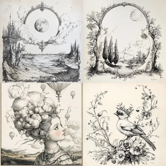 Монохромные палитры и приглушённые цвета усиливают романтическую и причудливую атмосферу, а точное черчение демонстрирует мастерство тонкой растушёвки и едва заметных контрастов.
