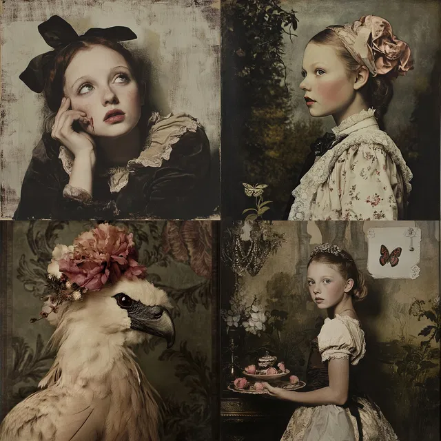 Волшебные композиции с винтажной патиной создают ностальгическую атмосферу, сочетая элегантность Викторианской эпохи с сюрреалистическими сюжетами. Мягкий фокус и приглушённое освещение усиливают неземные образы, придавая вневременную красоту в различных контекстах. Этот стиль отлично подходит для исторических и фэнтезийных тем, предлагая сложные детали и глубину повествования.