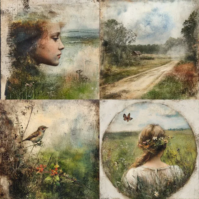 Стиль, характеризующийся живописной текстурой и многослойными композициями, вызывает чувство ностальгии и романтизма. Использование натуральных тонов и мягких цветов создаёт сказочную атмосферу, а глубина и атмосферность придают изображению эфемерность.