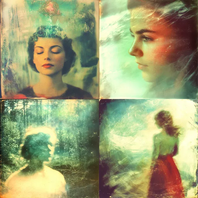 Преобладают мечтательная атмосфера и неземное сияние, каждый элемент пронизан ностальгическим настроением. Мягкое размытие и живописные текстуры создают сюрреалистичный подтекст, а приглушённые пастельные и винтажные тона усиливают ретро-эстетику.