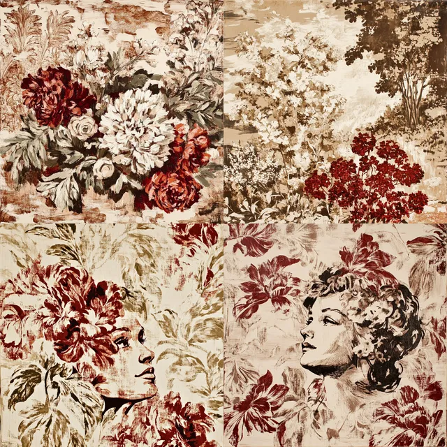 Стиль отличается ностальгическим теплом и винтажным шармом. Он прекрасно сочетает ботанические мотивы с текстурированными поверхностями, создавая вневременную элегантность в различных темах. Использование тонов сепии и землистых оттенков усиливает романтическое и историческое очарование, напоминая эстетику викторианской эпохи и ар-нуво.