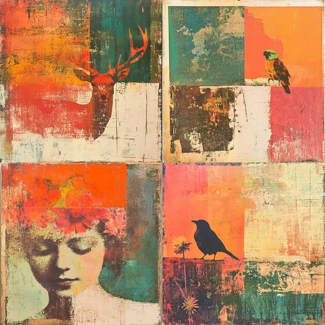 Этот стиль — поразительное сочетание фактурной абстракции и ностальгических образов. Через приглушённую цветовую палитру и шершавые, изношенные поверхности он передаёт атмосферу старины. Многослойные композиции создают ощущение глубины и сложности, а использование силуэтов и контуров добавляет загадочности.