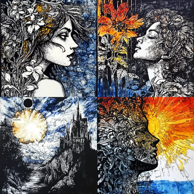 Этот стиль отличается насыщенной текстурой и сложной детализацией. В нём переплетаются влияния ар-нуво с современными элементами, создавая яркое полотно из цвета и линий. Взаимодействие смелых контрастов и глубоких слоёв рождает динамичное визуальное повествование, в котором преобладают органические формы и плавные структуры.