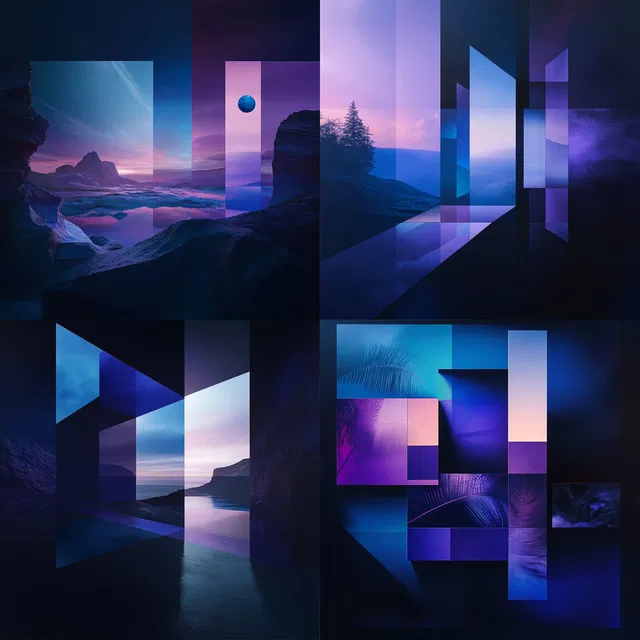 Преобладают яркие оттенки синего и насыщенного фиолетового, которые создают сказочную, эфемерную атмосферу. Зеркальные поверхности и многослойные композиции вызывают ощущение глубины и тайны. Геометрические формы пересекаются, придавая композиции структуру и плавность.