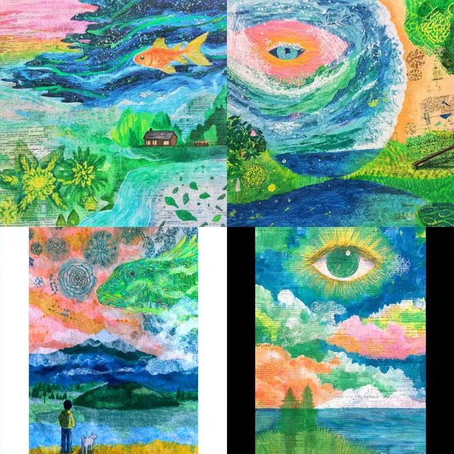 Сюрреалистичные и причудливые элементы придают работам мечтательное качество, а выразительные и творческие темы исследуют как фантастические, так и реалистичные сюжеты.