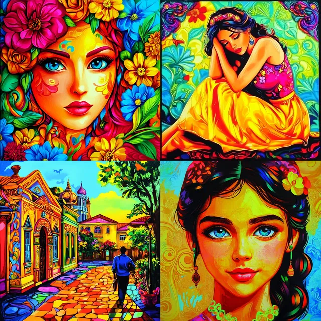 В этом стиле преобладают яркие, насыщенные цвета, которые создают живое и энергичное визуальное впечатление. Замысловатые детали и смелые контуры придают каждому изображению динамичность, будь то культурные мотивы или футуристические городские пейзажи.