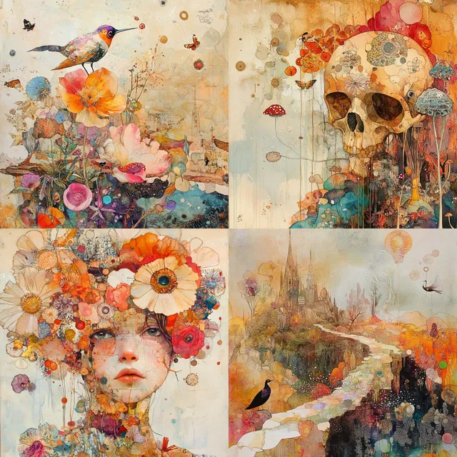 Этот стиль отличается яркой текстурой и замысловатыми слоями, которые создают сказочную, сюрреалистичную атмосферу, одновременно причудливую и чарующую. Его органические, плавные формы и яркая цветовая палитра создают ощущение движения и жизни, напоминая об искусстве модерна и символизме.
