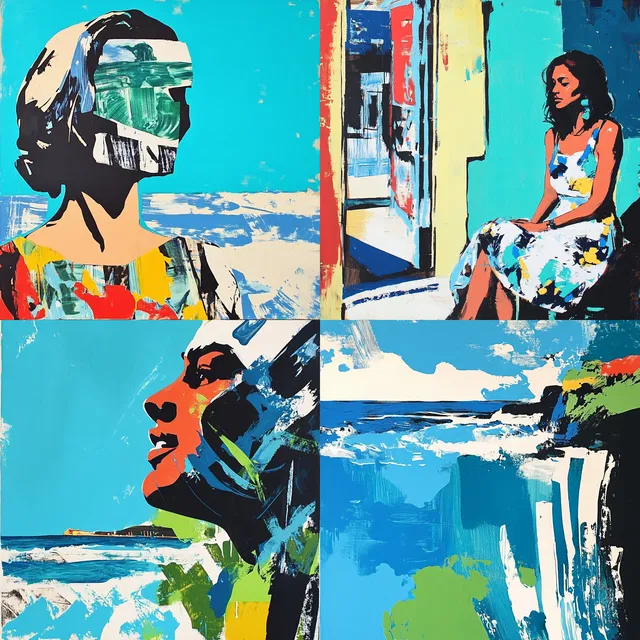 Доминируют яркие цвета и чёткие контуры, создающие динамичный и энергичный визуальный стиль. Использование контрастных оттенков и многослойных текстур добавляет глубины и интереса, а графический стиль придаёт современный, иллюстративный вид.