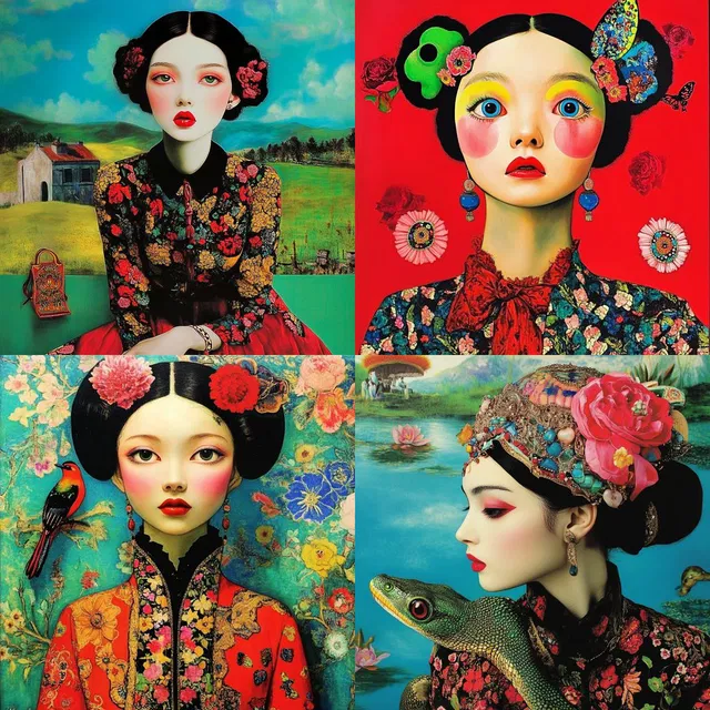 Яркие краски и сюрреалистичные композиции преобладают, сплетая замысловатые текстуры и эклектичные узоры в сказочное повествование. Причудливые персонажи и игривые предметы населяют пышные пейзажи, создавая богатую палитру воображения и фантазий.
