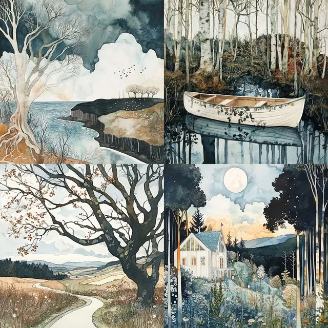Изящество акварельной живописи передаёт неуловимую красоту природы с помощью плавных акварельных размывок и изящных линий. Органичные формы и пастельная палитра создают безмятежную, сказочную атмосферу, напоминающую об искусстве ар-нуво. Хотя этот стиль превосходно подходит для создания спокойных и гармоничных композиций, ему может быть сложно работать с фотореалистичными или высокодетализированными техническими сюжетами, что ограничивает его универсальность в некоторых контекстах.