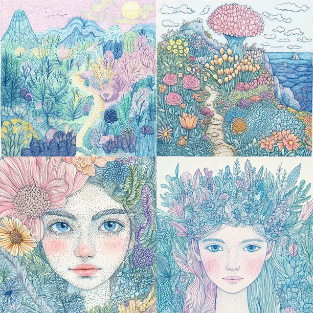 Изящные линии и мягкая пастельная палитра определяют этот стиль, создавая сказочную атмосферу, напоминающую модерн и импрессионизм. Причудливые элементы и мотивы, вдохновлённые природой, рождают безмятежное и спокойное настроение. Замысловатые детали и плавные формы демонстрируют гармоничное сочетание органических фигур.