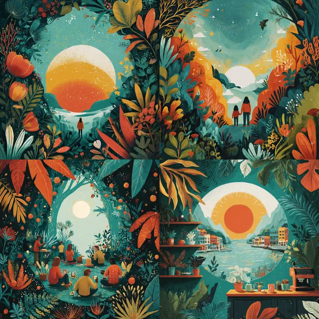 Для этого стиля характерны яркие цветовые палитры и игривые мотивы. Он отличается пышными композициями, вдохновлёнными природой. Использование смелых контрастов и динамичных макетов создаёт живую и весёлую атмосферу, напоминающую наивное искусство и народные традиции.
