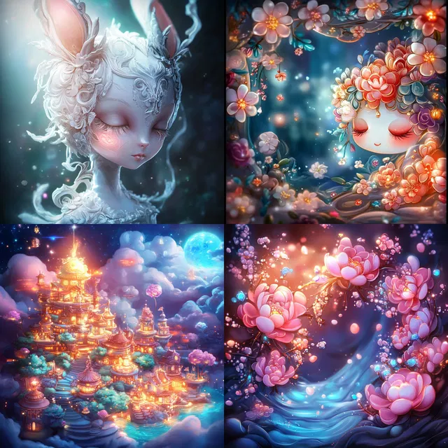 Этот стиль характеризуется неземным сиянием и сказочными текстурами, в которых причудливые детали сочетаются с чарующими композициями. Мягкие градиенты и яркие оттенки создают волшебную атмосферу, напоминающую иллюстрации из книг с историями и фантазийное искусство.