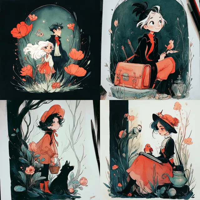 Причудливый и чарующий стиль, который характеризуется приглушённой палитрой и плавными линиями, создающими ощущение чего-то сказочного. Этот стиль отлично подходит для создания иллюстраций с повествованием, в которых основное внимание уделяется сюжетным линиям, сосредоточенным на персонажах. Изящные детали и замысловатые узоры придают каждому произведению магическую сущность, напоминая об искусстве ар-нуво и романтизме.