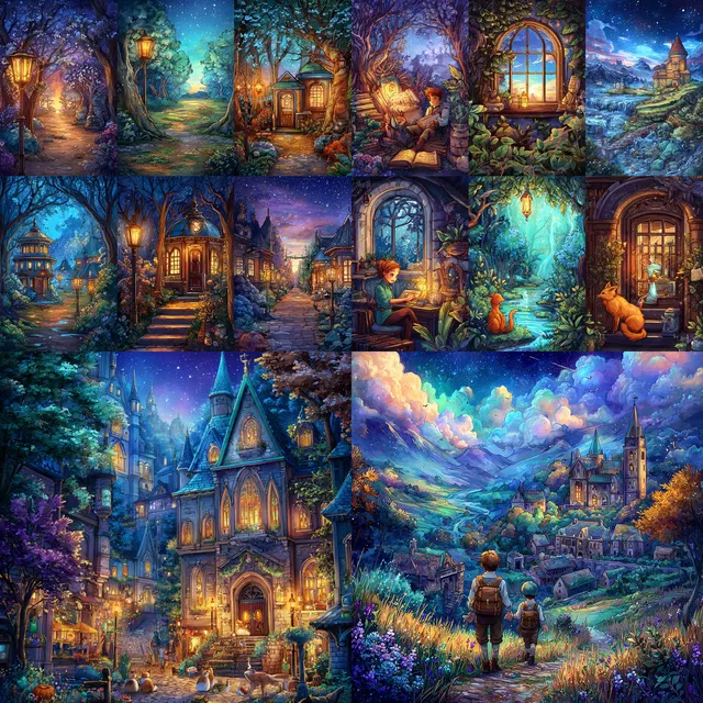 Этот яркий и причудливый стиль очаровывает своими светящимися цветами и замысловатыми деталями. Он прекрасно создаёт магические атмосферы, сочетая фантазию с игривыми элементами. Использование сияющих оттенков и выразительных персонажей придаёт каждому произведению сказочное качество.