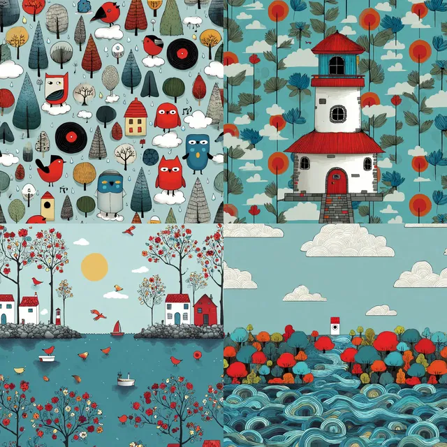 Яркий плоский дизайн и смелые контуры определяют этот стиль, объединяя эстетику середины XX века с игривыми, причудливыми мотивами. Использование упрощённых форм и графической чёткости создаёт весёлую, беззаботную атмосферу, напоминающую скандинавское народное искусство и влияние поп-арта. Яркие оттенки и смелые контрасты усиливают визуальную привлекательность, что делает стиль идеальным для детских книг, текстильного дизайна и брендинга.