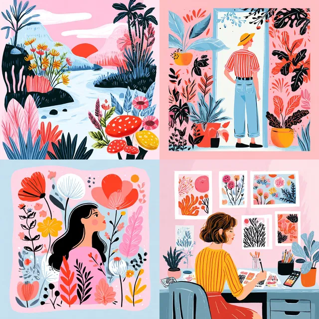 В этом стиле преобладают яркие цвета и смелые контуры, которые создают игривый и причудливый визуальный язык. Использование плоских цветов и упрощённых форм придаёт графическую чёткость, напоминающую эстетику середины XX века и современную иллюстрацию. Широко распространены органические узоры и цветочные мотивы, которые наполняют работы живой и весёлой атмосферой.