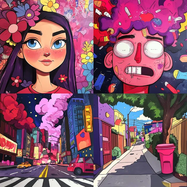 В оформлении преобладают чёткие контуры и яркие цвета, создавая игривую и причудливую эстетику. Карикатурные персонажи и утрированные черты придают энергии и юмора, а динамичные композиции и графическая чёткость усиливают визуальное воздействие. Этот стиль прекрасно подходит для современной поп-культуры, может быть использован в детских книгах, анимации и брендинге. Однако ему может не хватать тонкости и глубины в более сложных или фотореалистичных приложениях.