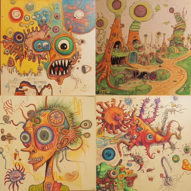 Этот яркий и причудливый стиль наполнен игривой энергией и сюрреалистичными образами. Замысловатые линии и смелые цвета создают атмосферу мечты, напоминающую сказочную страну детства.