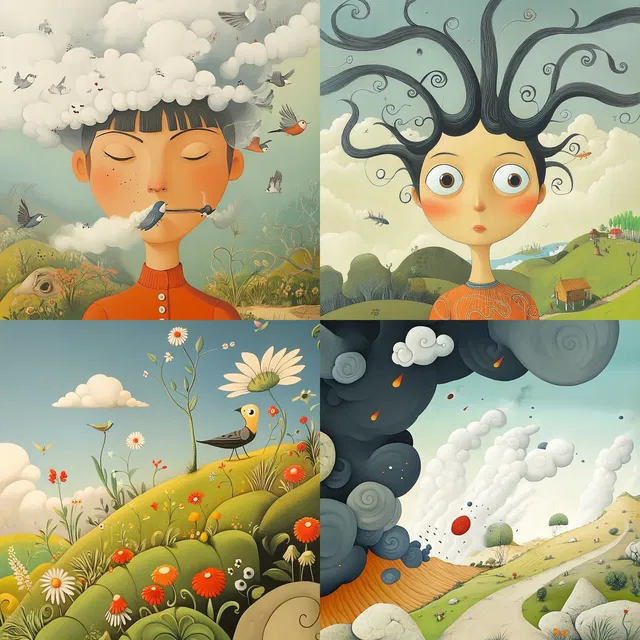 Сюрреализм встречается с причудливостью в стиле, который очаровывает своей сказочной атмосферой и чарующими визуальными образами. Мягкие градиенты и плавные контуры создают игривую, но утончённую эстетику, напоминающую иллюстрации из детских книжек. Органичные формы и вихревые мотивы преобладают, придавая фантастическое качество как персонажам, так и пейзажам.